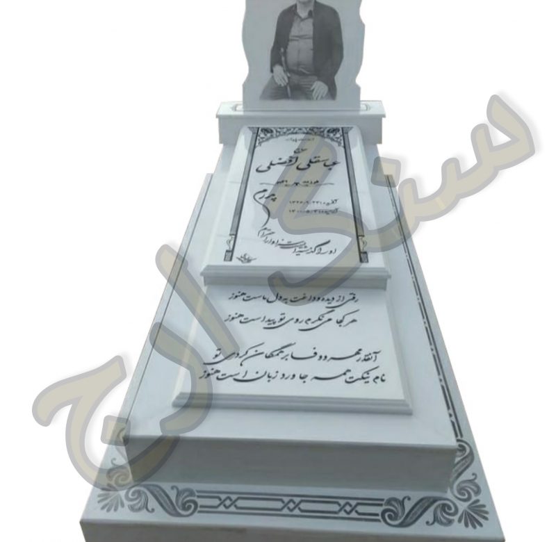 سنگ قبر سفید نانو طرح دار درجه 1 با استقامت بالا و قطر 3 سانت .از یک دست  قرنیز از جنس مرغوب استفاده شده است. خط به کار رفته سفارشی و بسیارزیبا.